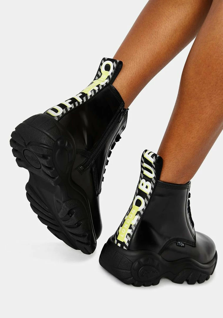 because youâre a natural born killa. Murder the dance floor in these patent calfskin leather booties with a chunky bubble sole and a graphic buffalo logo strap on the back of the heel.