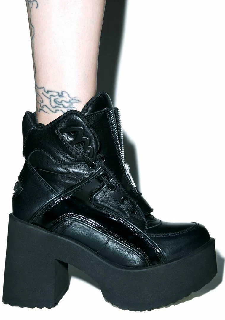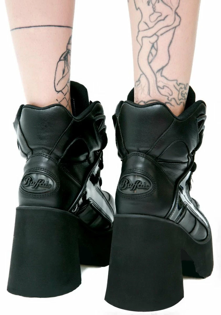 knows who the baddest is. IT ME. Yew better run shit, ya lil diva, with these sik ankle boots constructed from super soft leather with chic tonal patent trim plus ultra lightweight 4â inch heels and 1.5â platforms. Featuring a comfy af padded interior, signature multi-layer front with badass exposed zipper and iconic Buffalo logo at the back of yer heels.