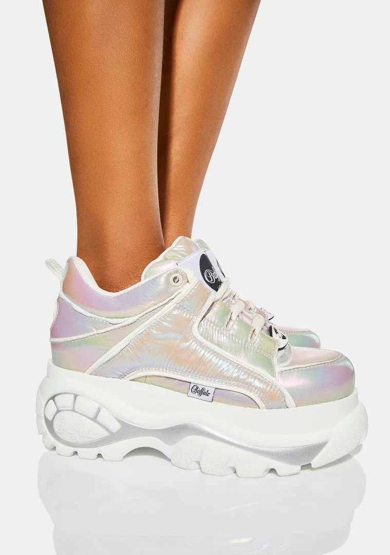 cuz itâs time to spice up your life! These chunky platform sneakers have a vegan leather construction with a pastel rainbow metallic finish, memory foam insoles, padded collars and tongues, branded logo badges, and adjustable lace-up closures.