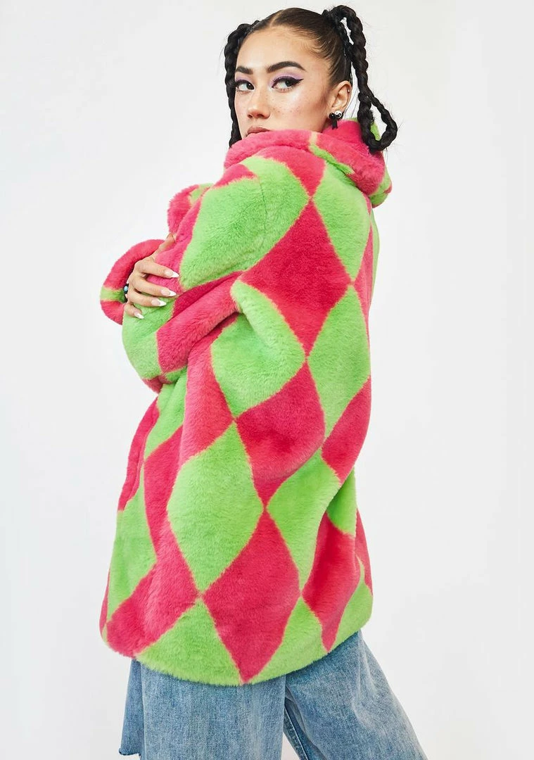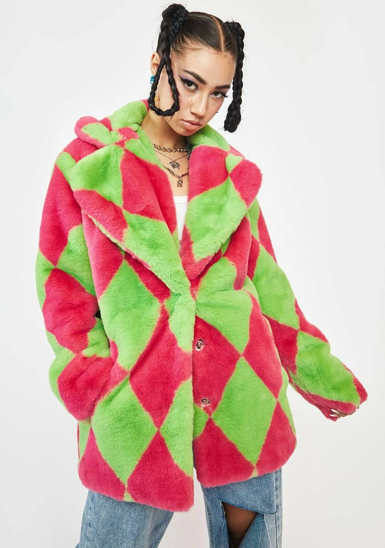 cuz youâve got that âitâ factor. This super soft faux fur coat has an argyle print all over, snap button closures, and pockets on the sides.