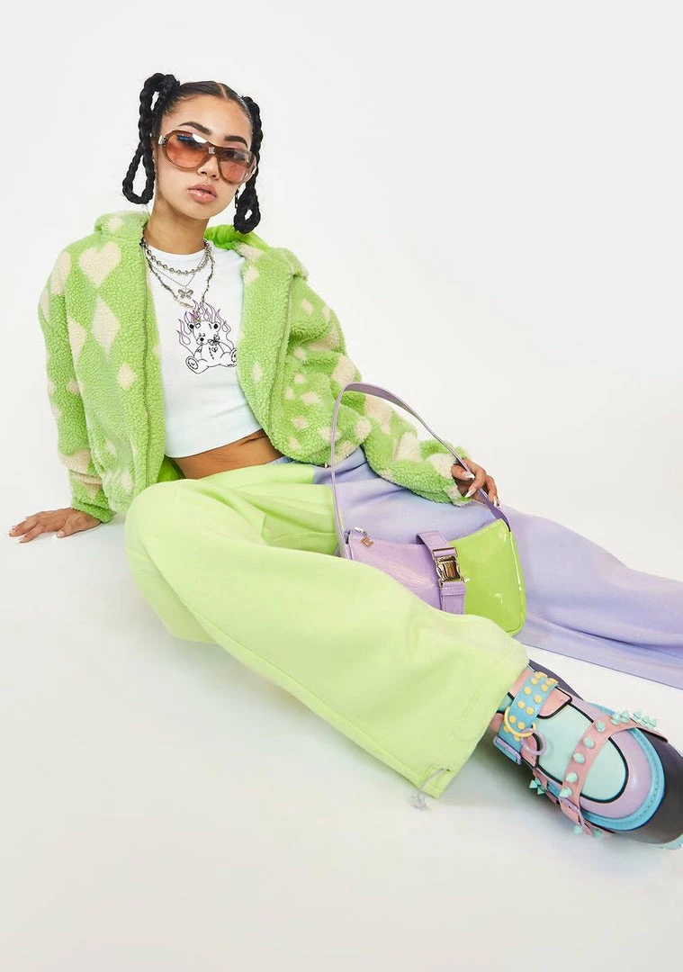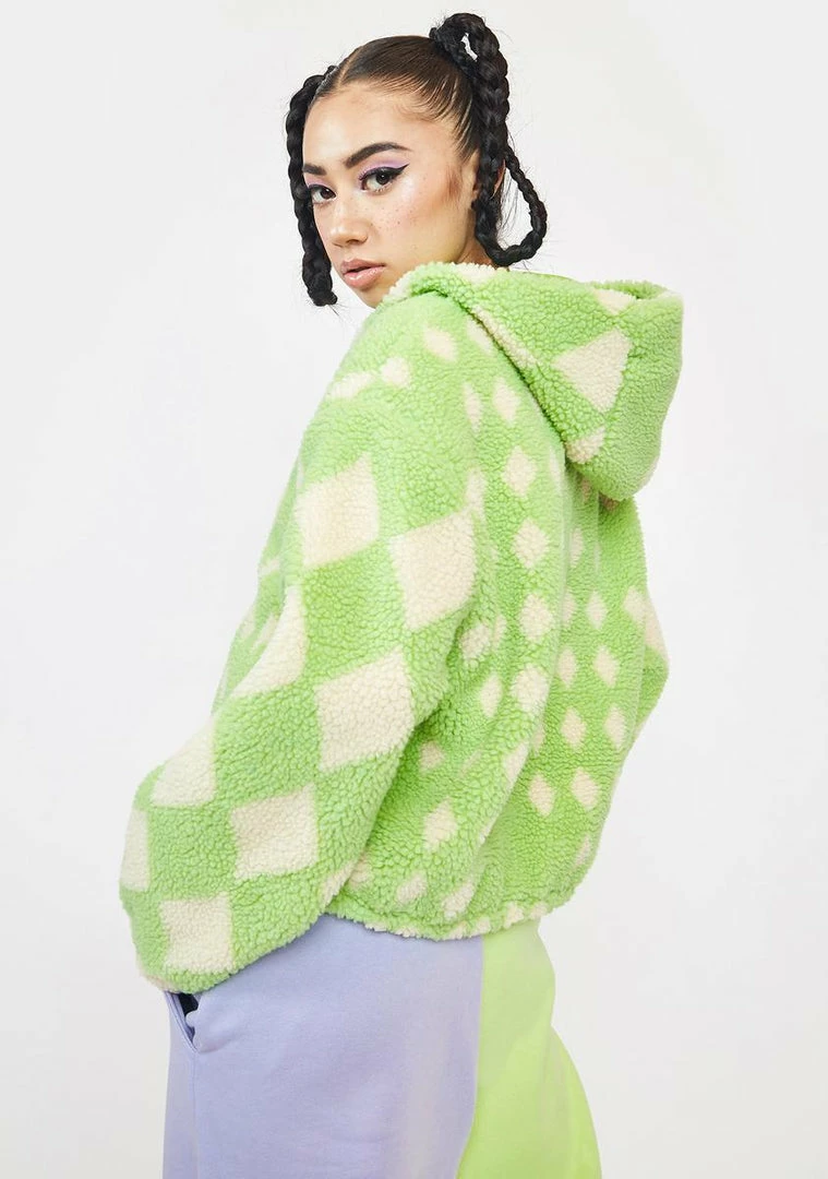 cuz youâre the sweetest treat! This hooded teddy jacket has a super soft fleece construction, a slightly cropped fit, pockets on the sides, and an argyle print all over with heart details.