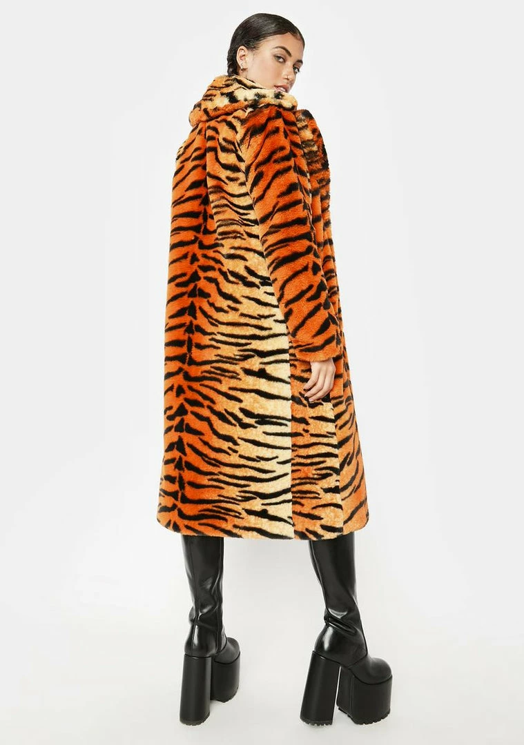 cuz youâre one fierce kitten! This longline coat has a super soft faux fur construction, a spread collar, pockets on the sides, snap button closures, and a tiger print all over.