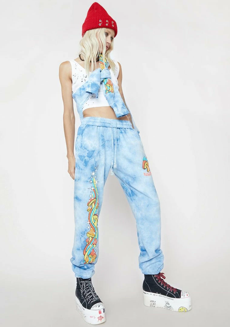 cuz itâs a colorful life. These tie dye sweatpants have an elastic waistband, side pockets, and trippy shroom graphics.
