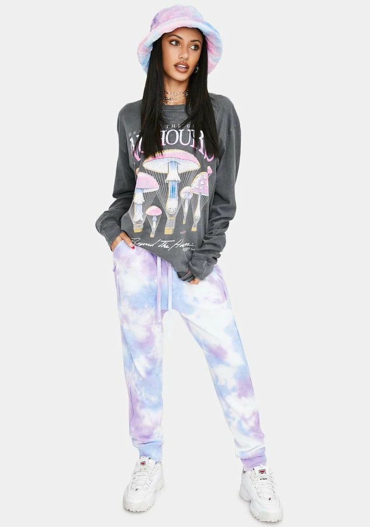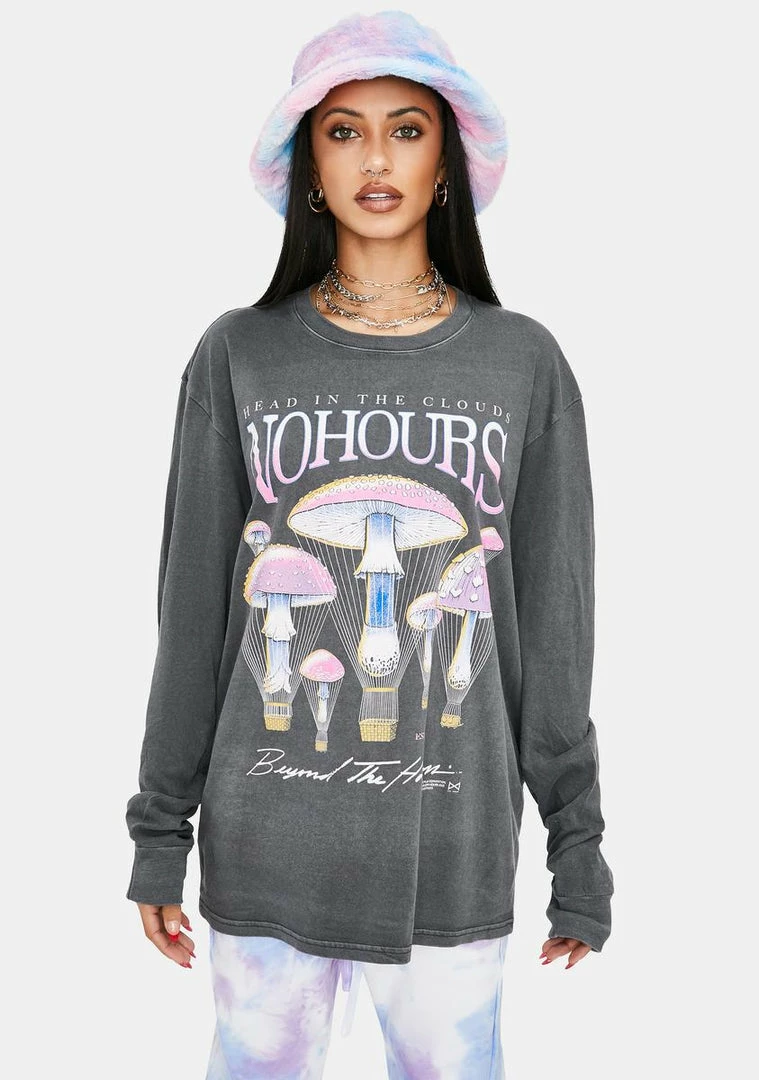 cuz youâre stuck in a daze. This long sleeve t-shirt has a relaxed fit, a washed grey look, and shroom graphics on the front.
