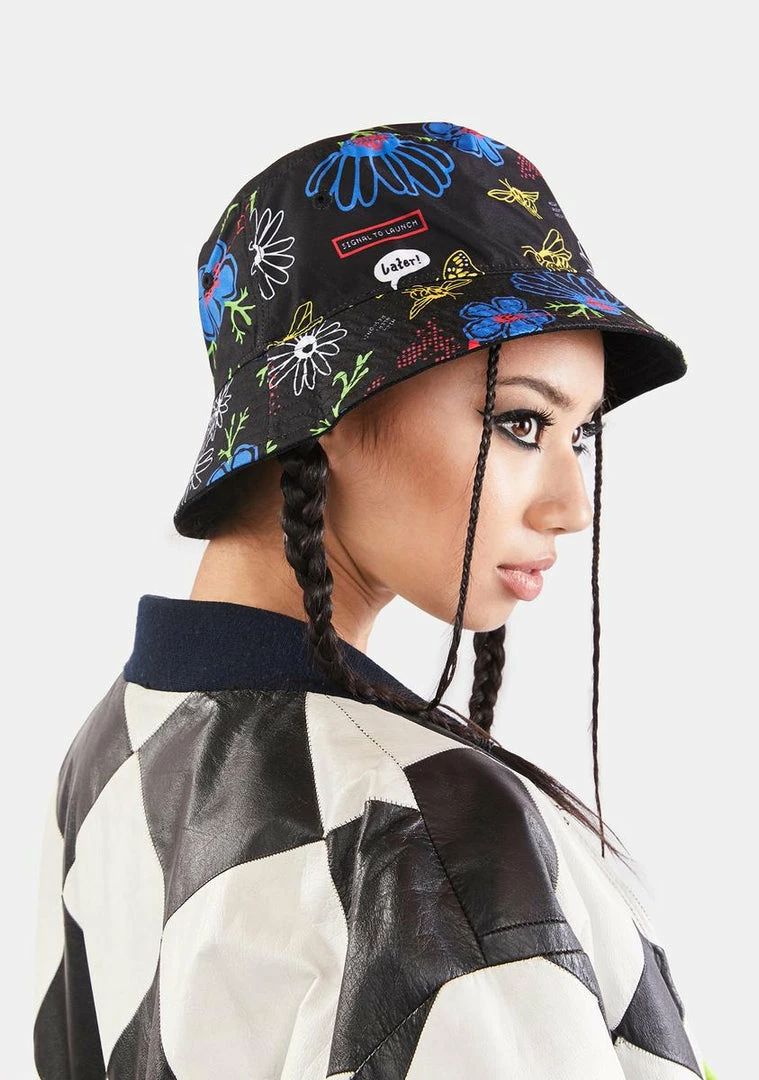cuz you donât come with a warning. This reversible bucket hat has a wide stitched brim, mixed floral graphics on one side, and black corduroy with embroidered butterfly logos on the other.