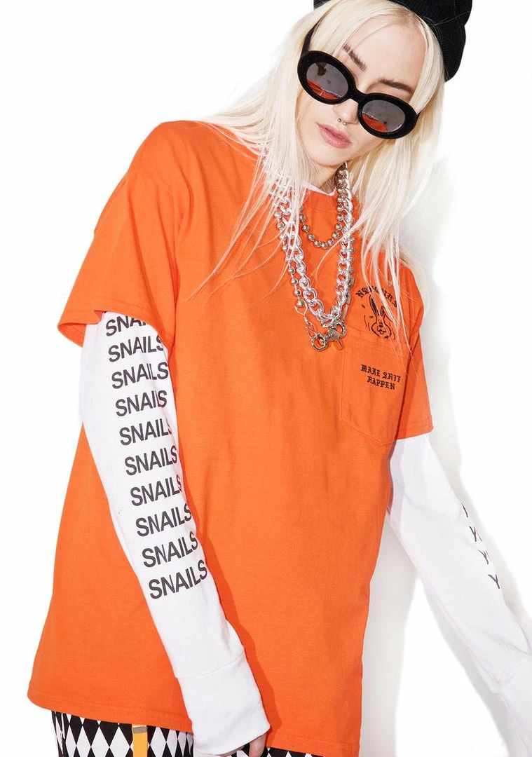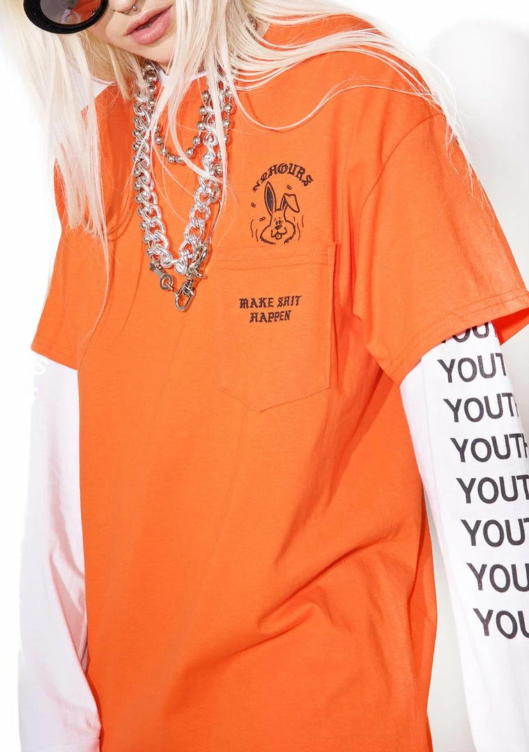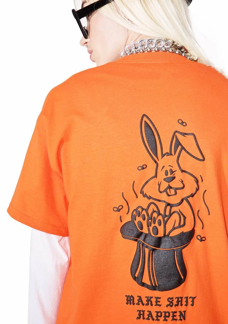 cuz if yew want somethinâ yew gotta work for it, babe. This orange tee features a classikk t-shirt construction, a front chest pocket with a lil bunny peekinâ out, and a graphic on the back of a bunny takinâ a sh*t in a hat with black âMake Shit Happenâ text underneath.