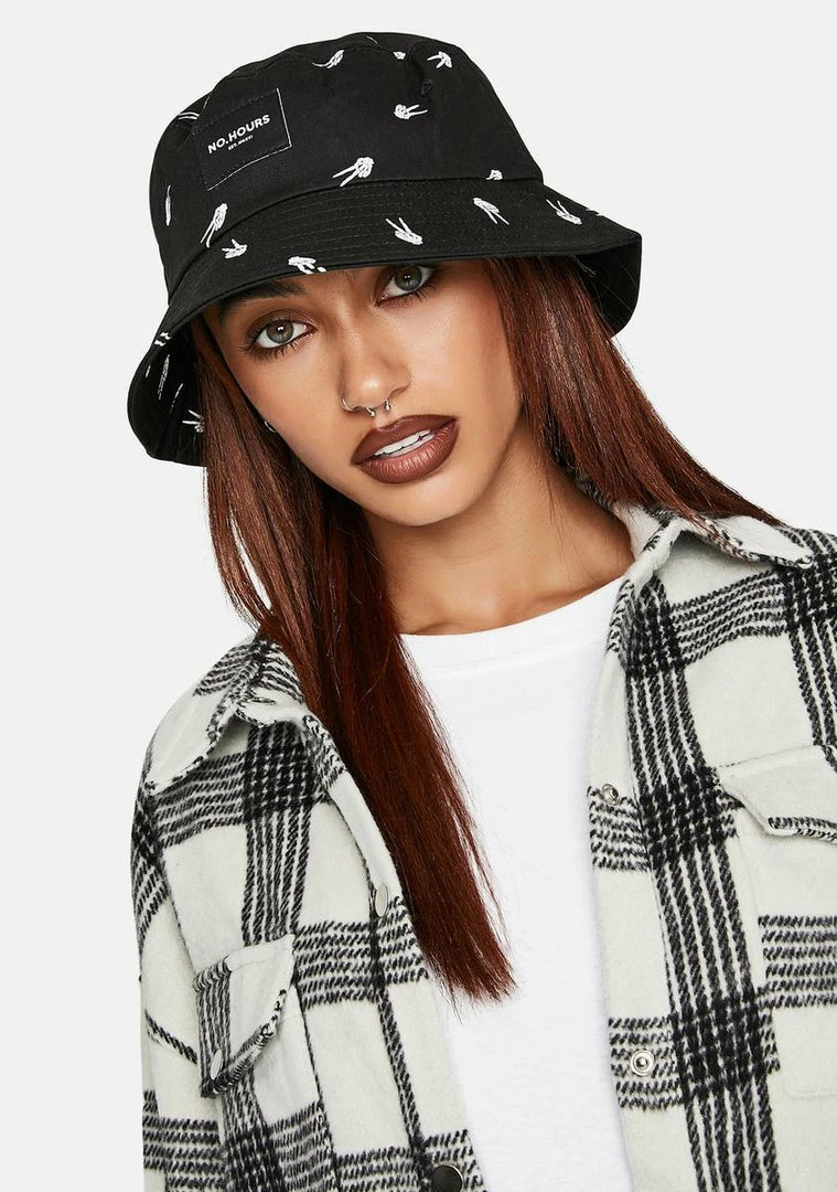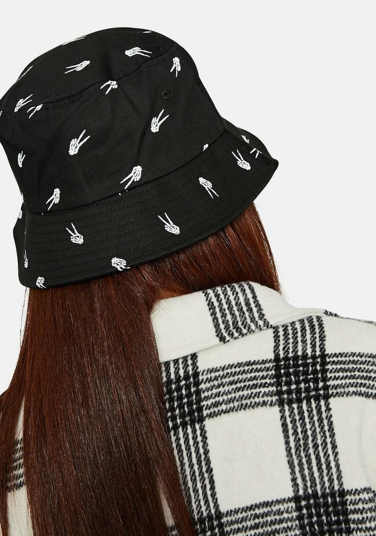 cuz you’re easy going. This cotton twill bucket hat has a skeleton hand peace sign print all over and a woven label detail.