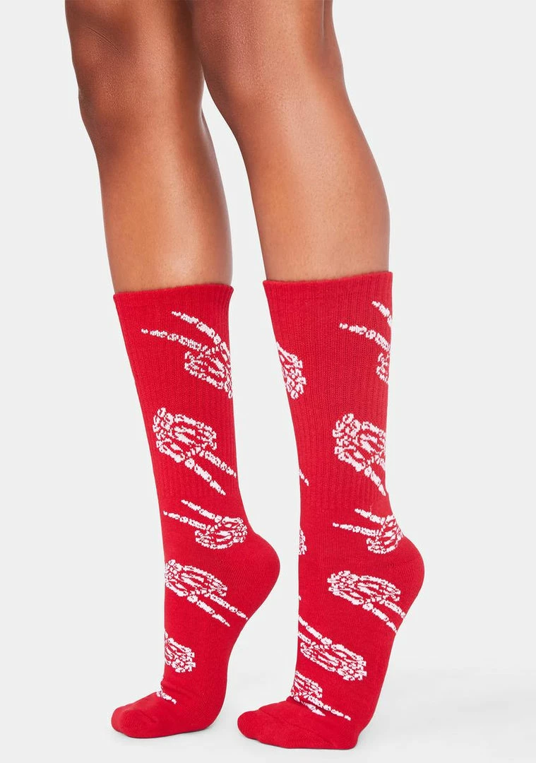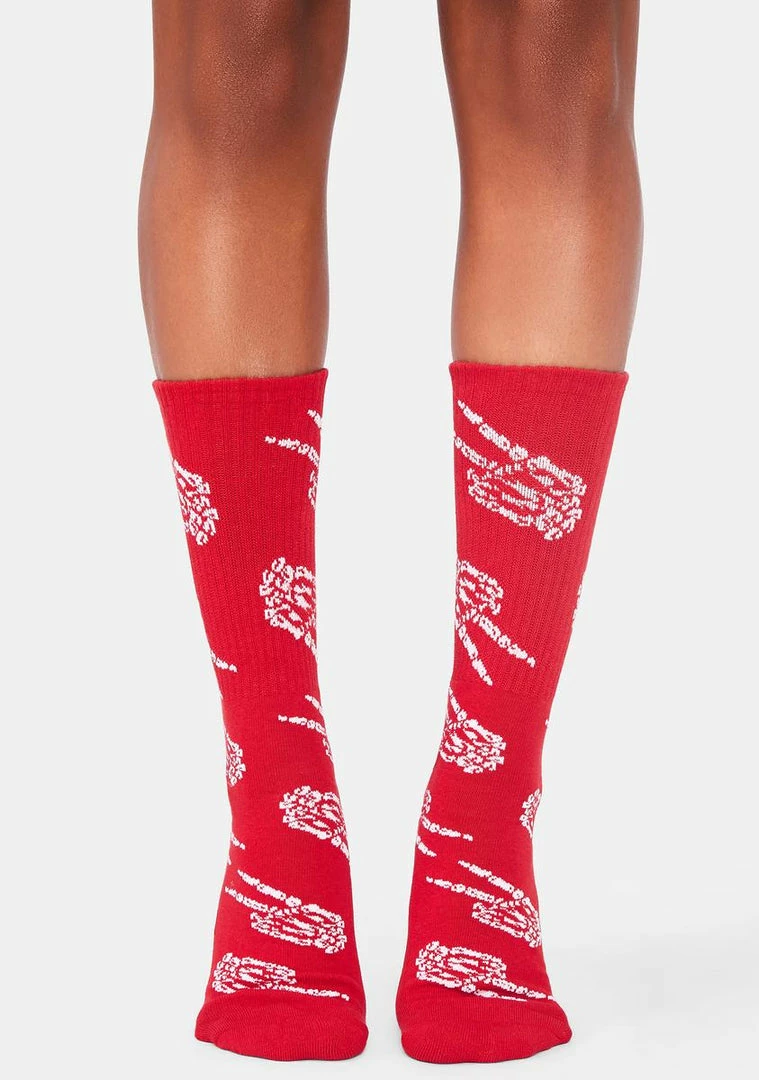 keep on keeping on. These graphic crew socks have a stretchy ribbed fit and skeletal peace signs all over.