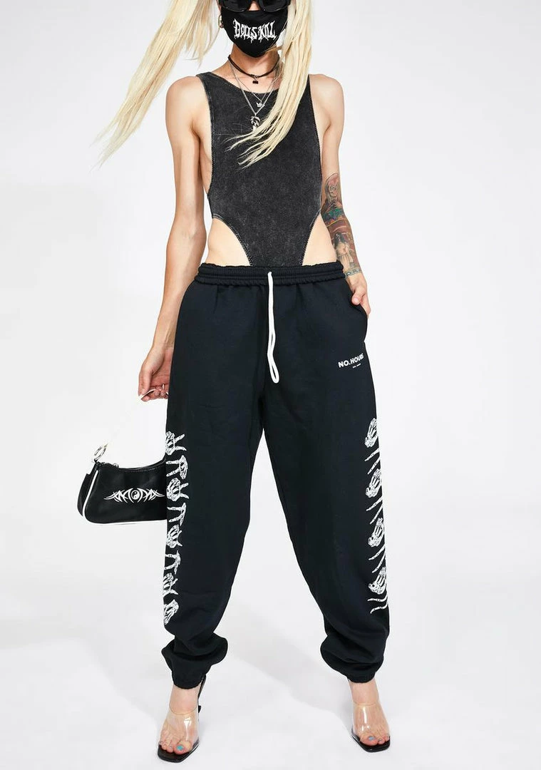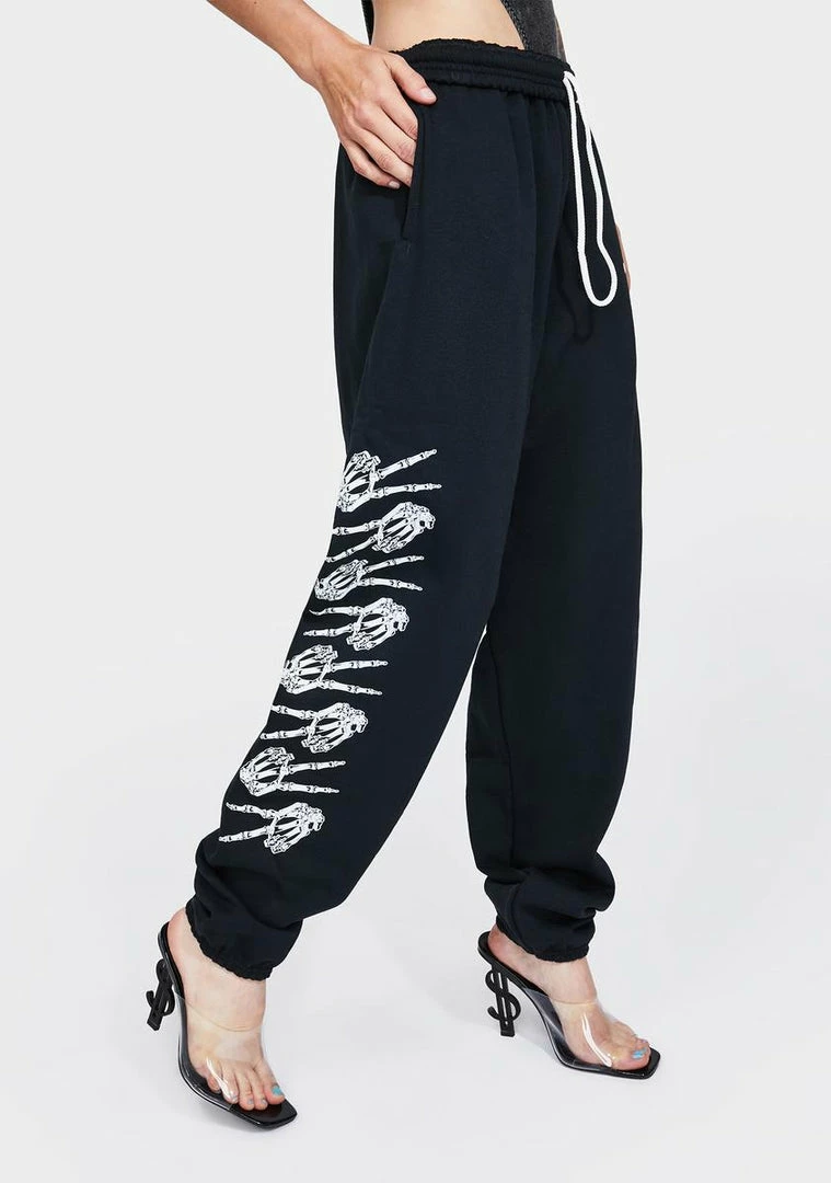 cuz youâre easy going. These sweatpants have a drawstring waistband, pockets on the sides, and skeleton peace sign graphics.