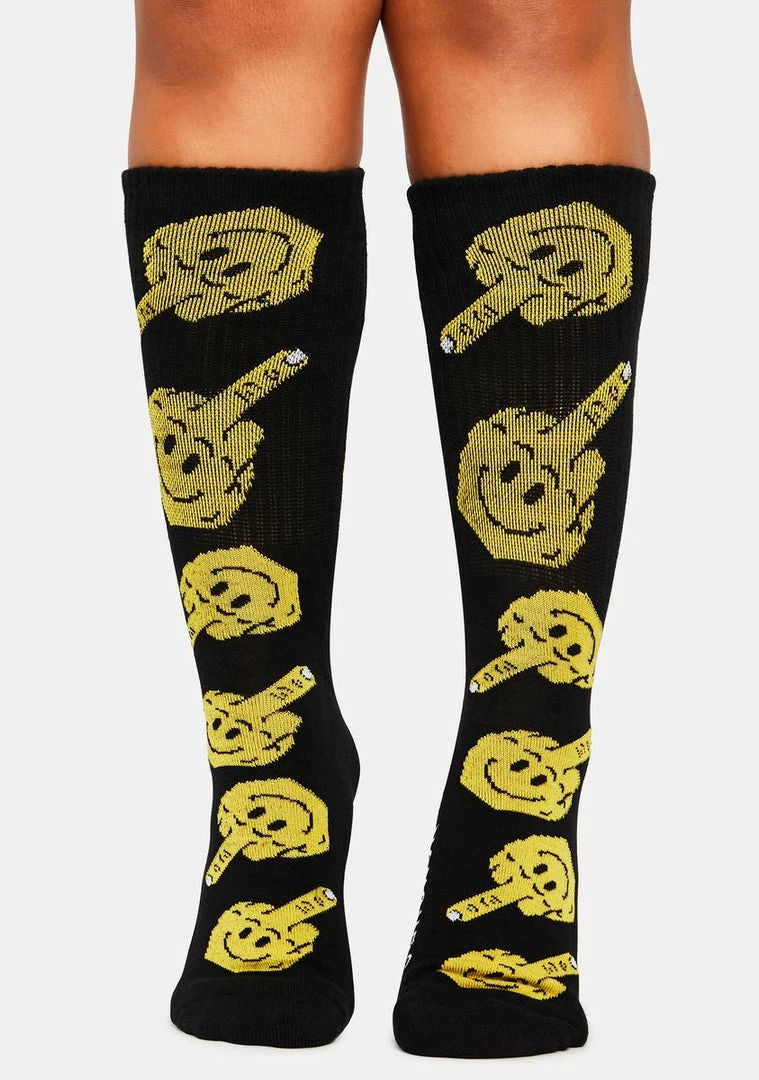 because you express your feelings. These crew socks have a hand with a smiley face.