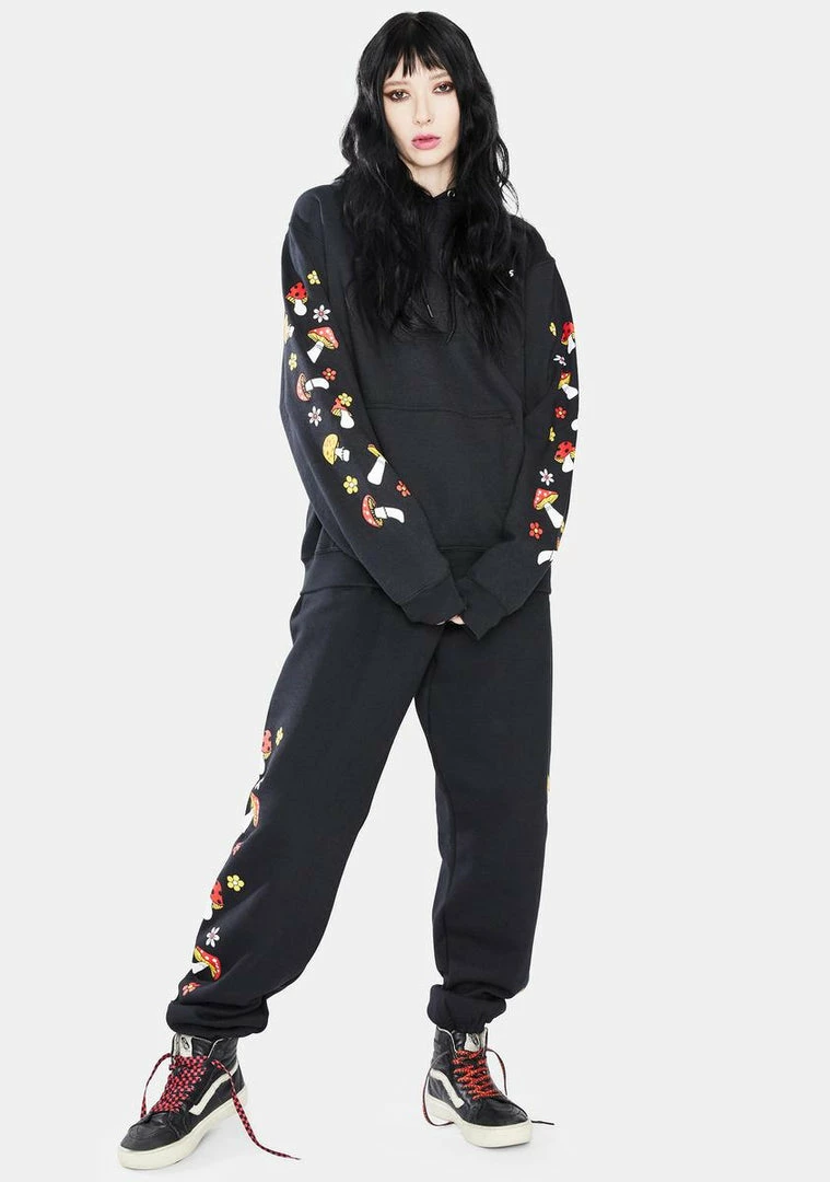 wanna go to wonderland? This hoodie has drawstring pulls, a kangaroo pocket, and shroom graphics on the sleeves.