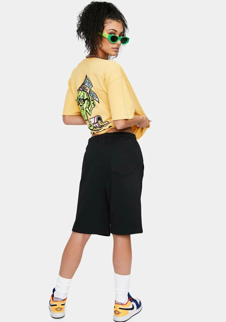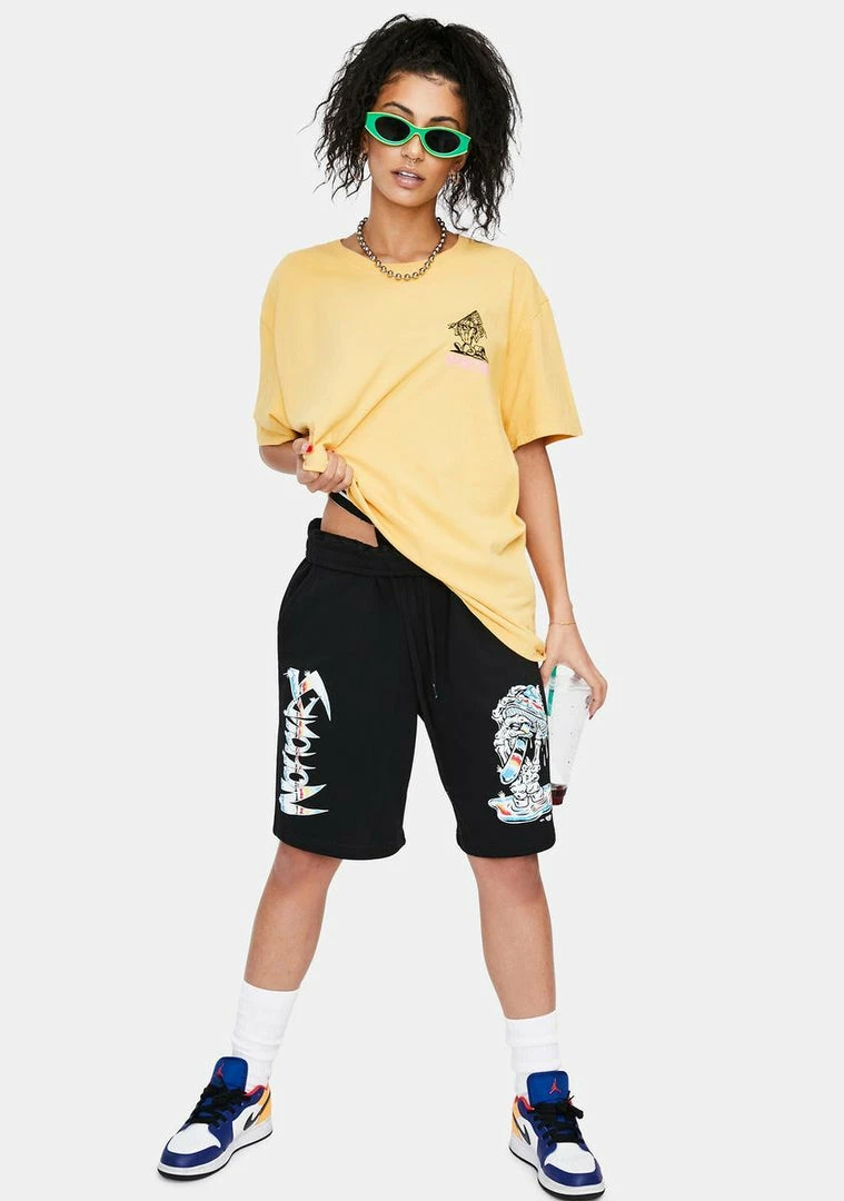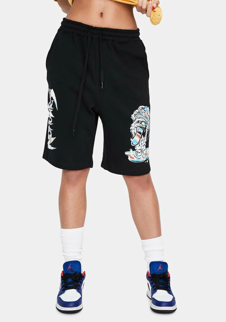 trip out in the next life, babe. These sikk sweat shorts have side pockets & one back pocket, a drawstring waistband and psychedelic graphics down the front.