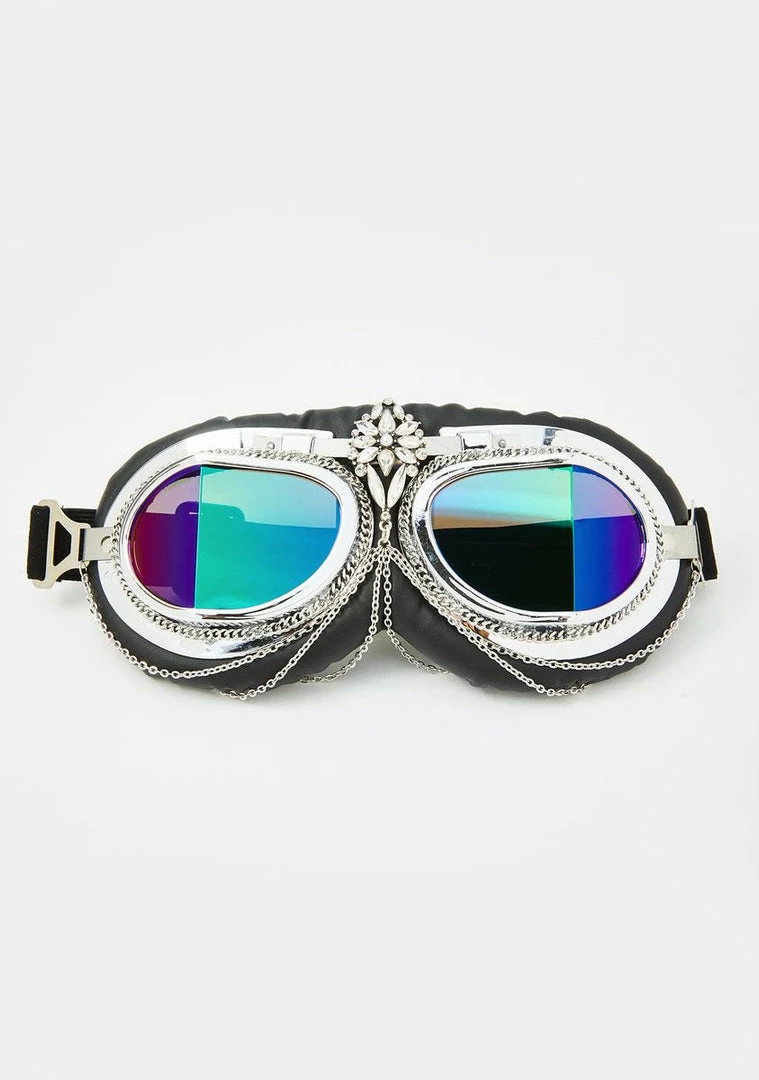 fuxx reality, let’s live at the rave! Feel the bass in yer bones in these aviator-style festival goggles that have trippy iridescent lenses, rhinestone N’ chain accents, cushioned lining on the frame, and an adjustable elastic headband.