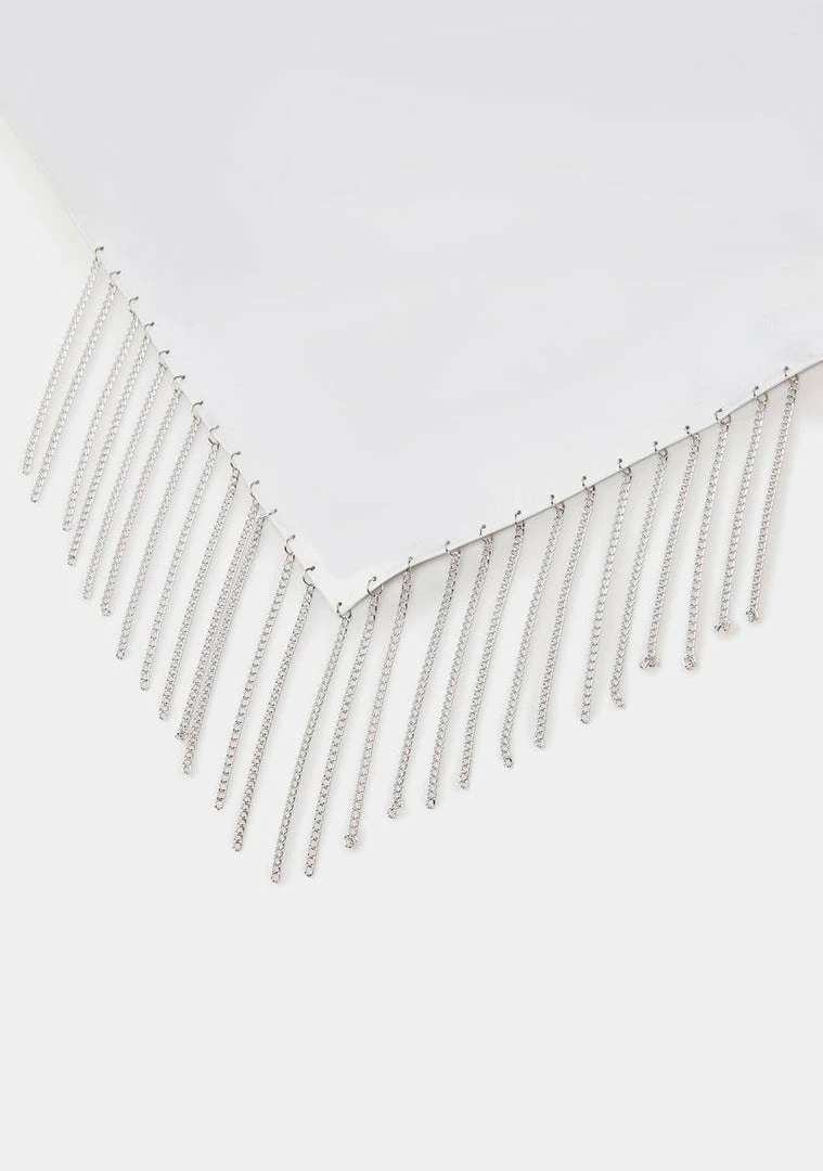 shine on, babe! This bandana has a silver reflective material with chain fringe trim.