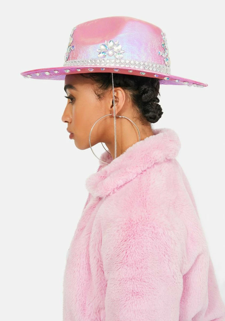 give âem western glam! This iridescent cowboy hat has statement jewels, rhinestone trim, and a hanging chain strap.