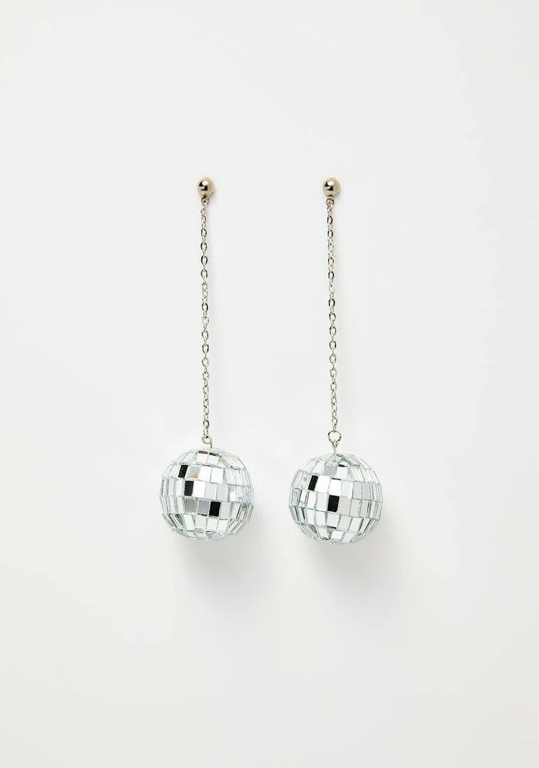 will have ya dancinâ on fire babe! Go supersonic in these chain drop earrings that have post back closures and reflective mirror disco balls.