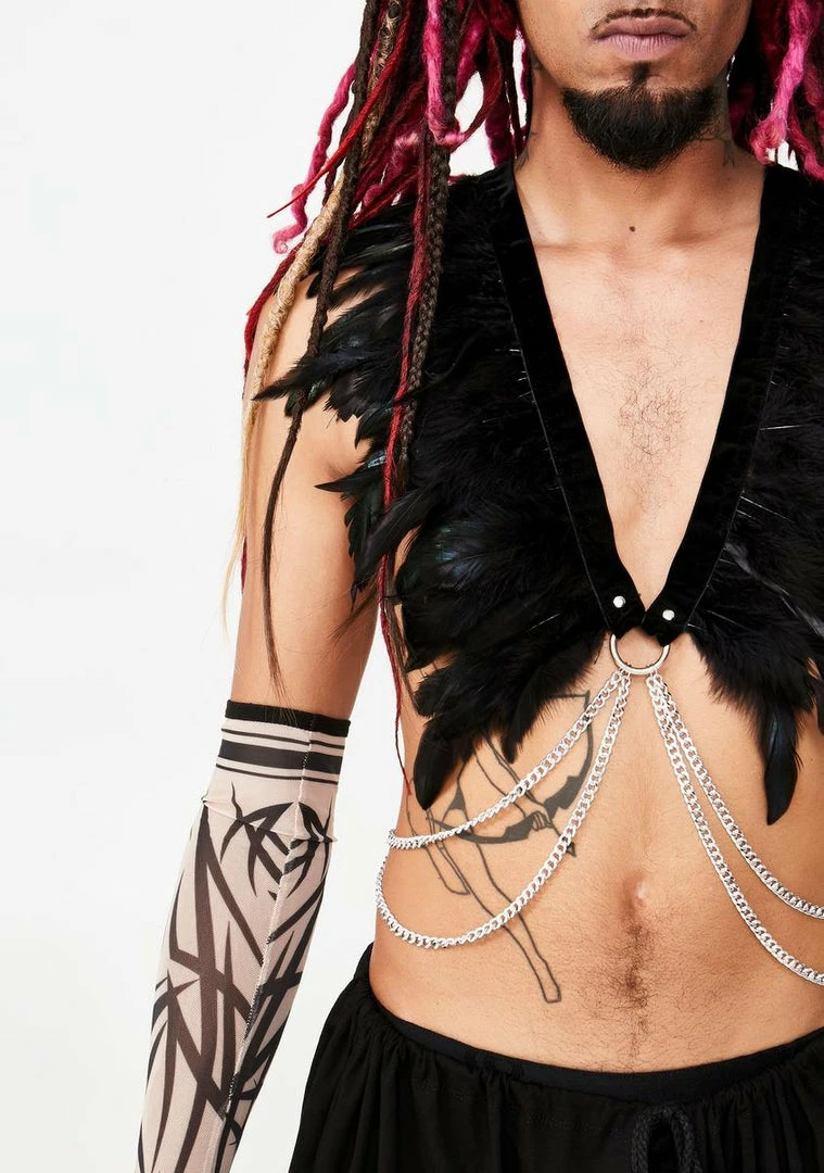 will bring ya deeper into the night. You’re a desert rager in this unisex body chain that has feather trim and clasp closures on the back. WARNING: May cause MOOP!